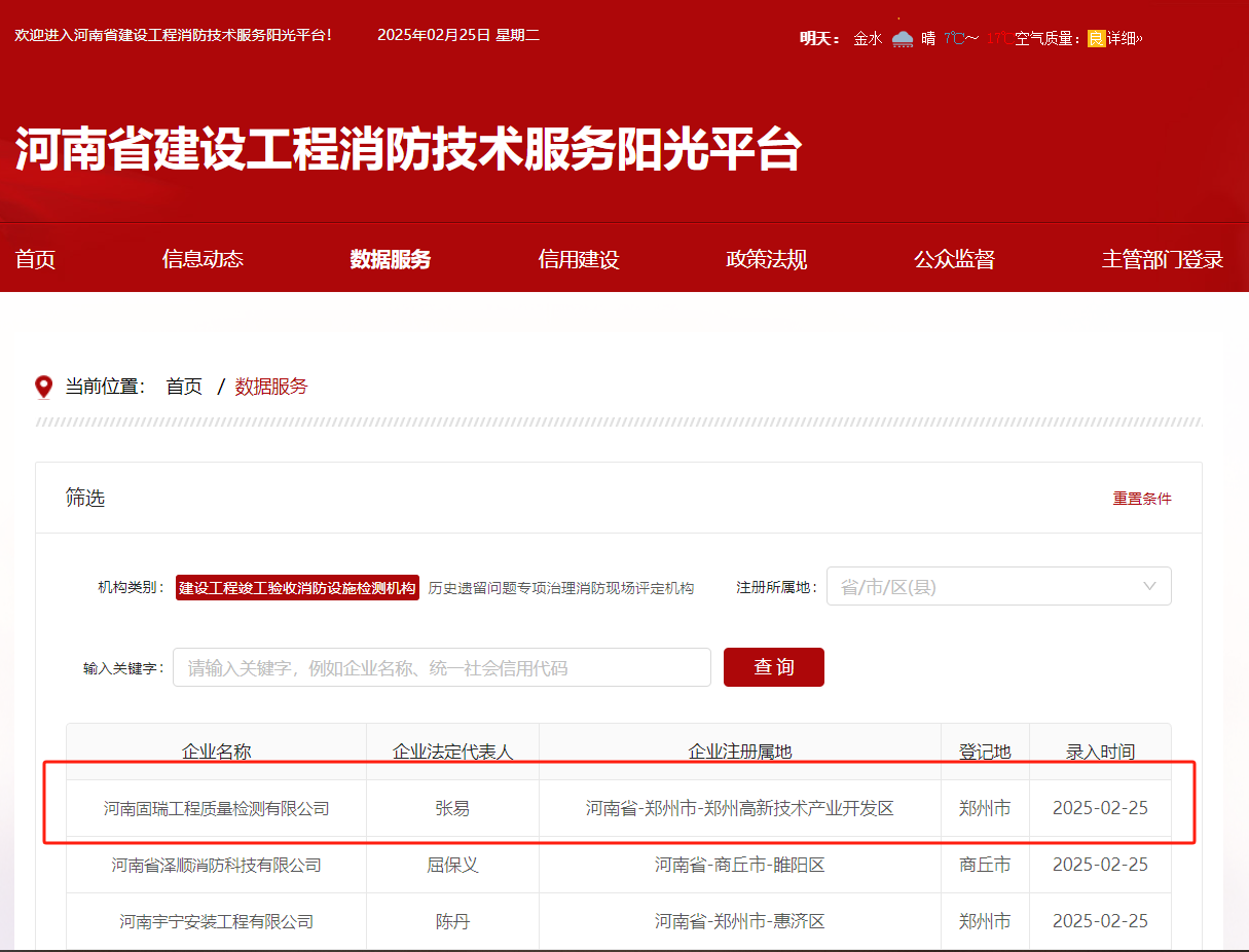 • 熱烈祝賀河南固瑞工程質量檢測有限公司入冊河南省建設工程消防技術服務陽光平臺!!!